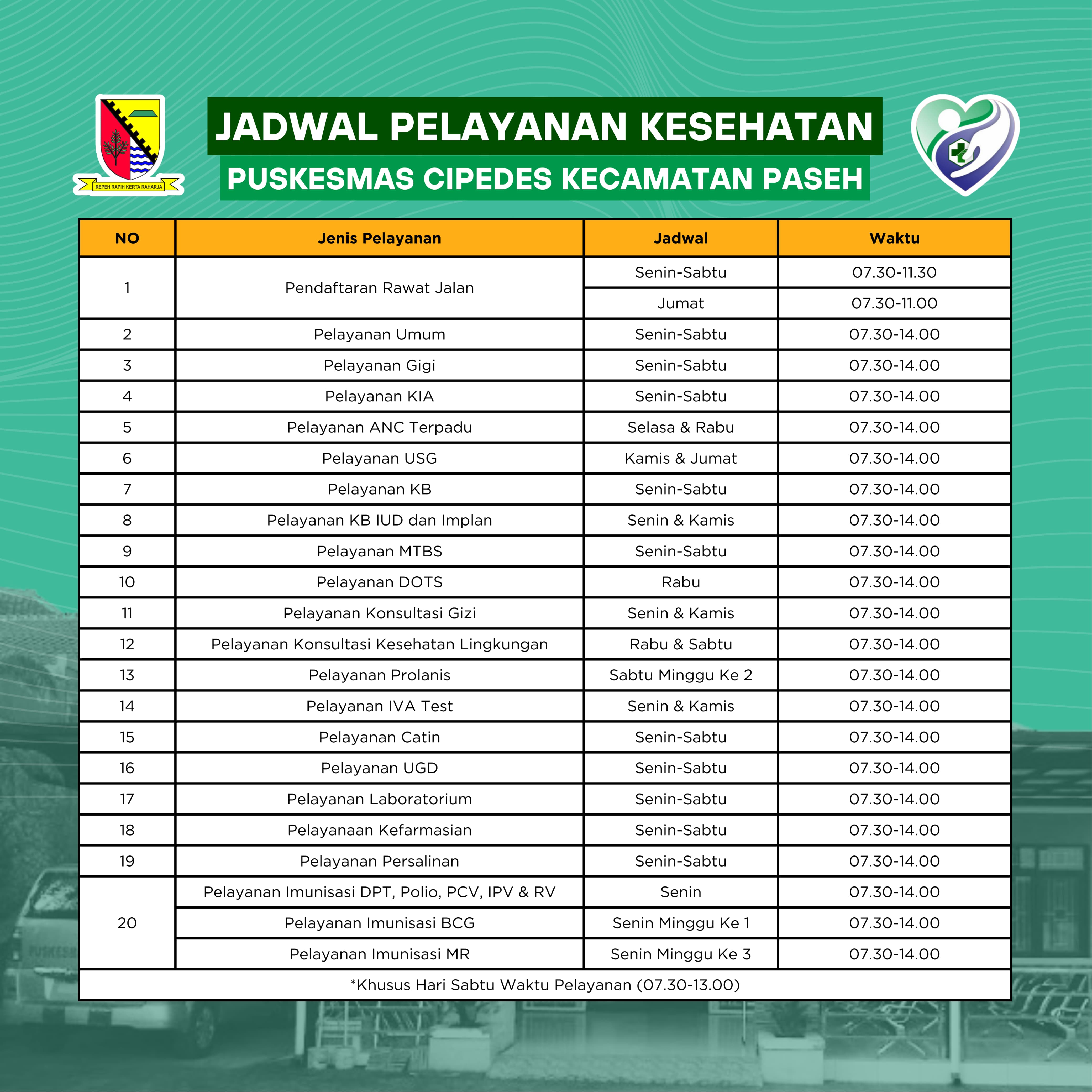 Berikut jadwal pelayanan kesehatan di Puskesmas Cipedes 🙏