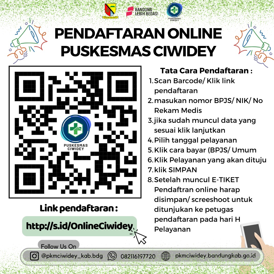 Pendaftaran online bisa dilakukan bagi pasien yang sudah pernah berobat ke Puskesmas Ciwidey dengan cara memasukan link pada browser : s.id/OnlineCiwidey