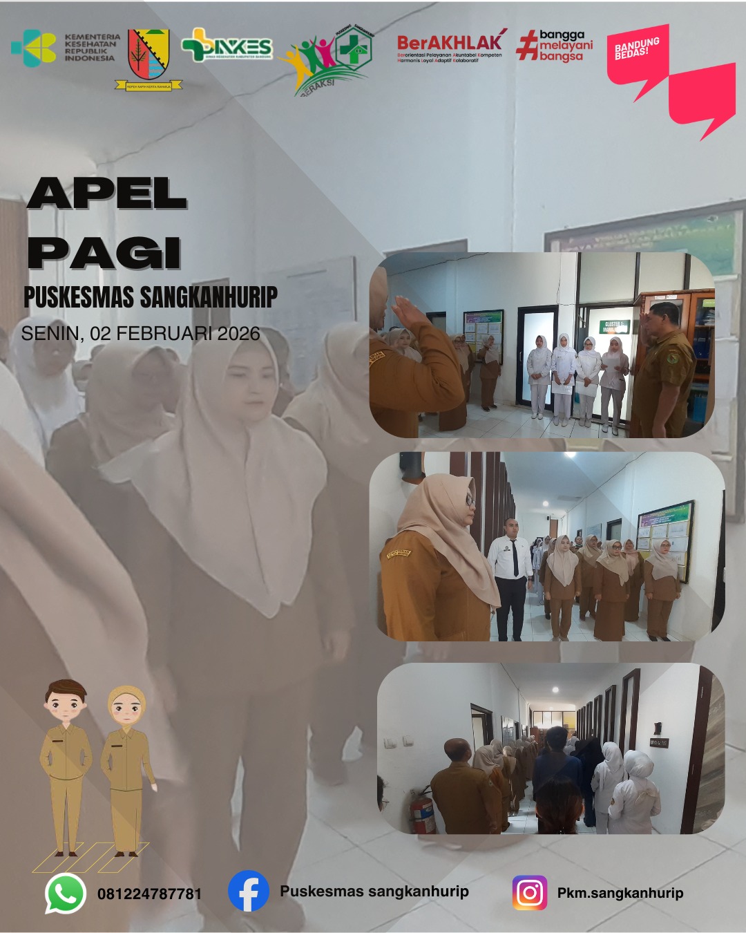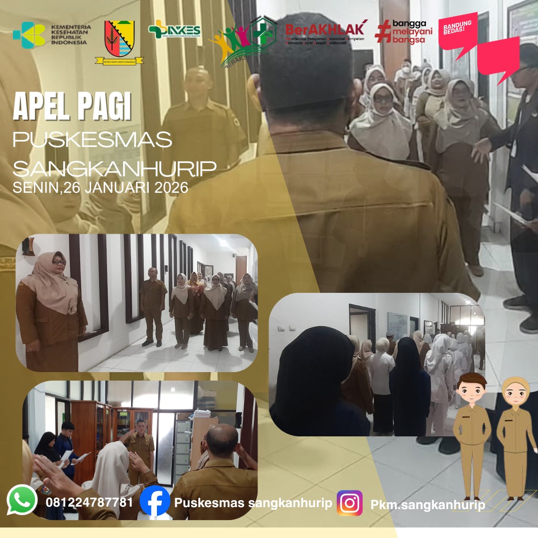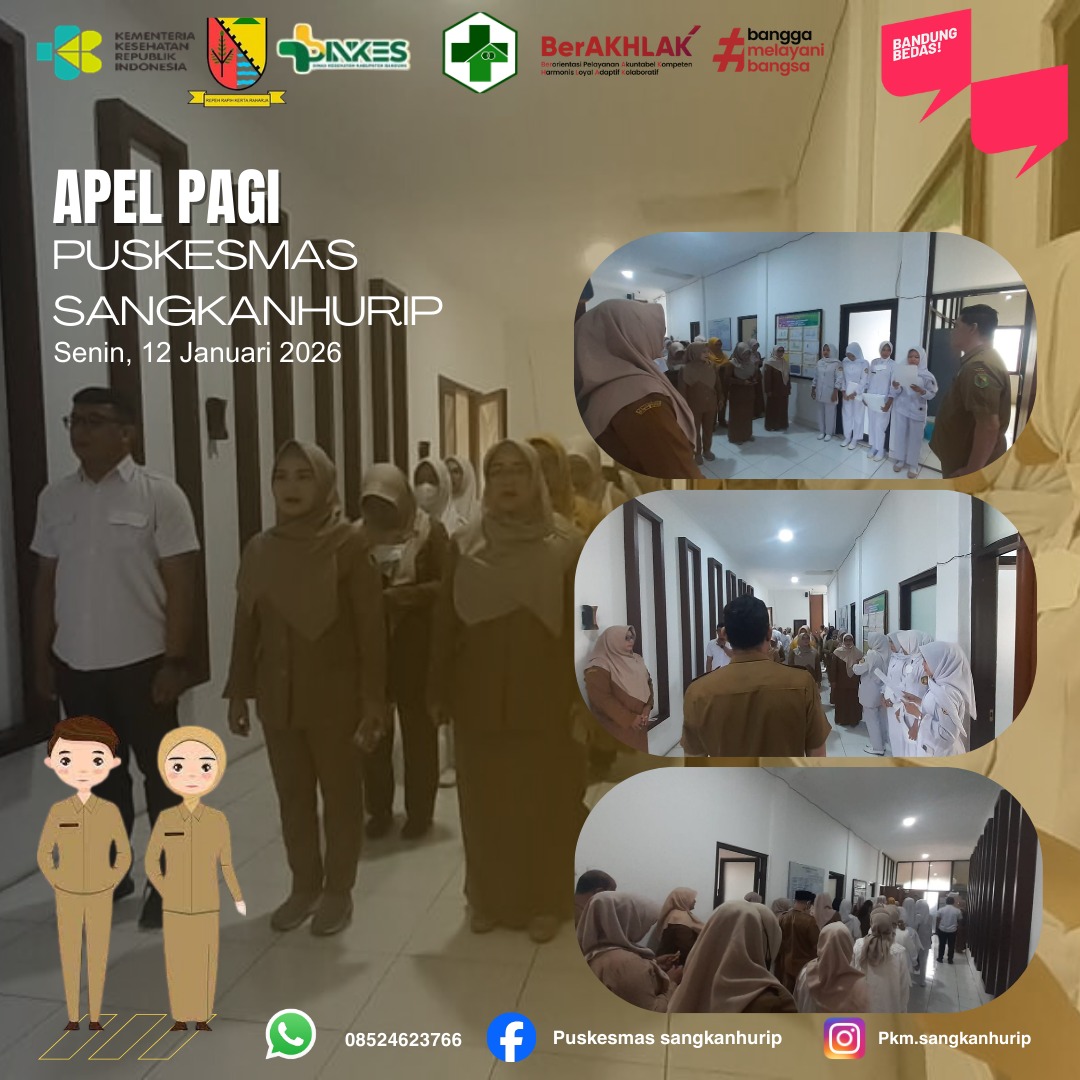 Apel pagi di puskesmas sangkanhurip adalah kegiatan berkumpul rutin yang dilakukan semua staf puskesmas sangkanhurip dengan tujuannya untuk meningkatkan disiplin, pengecekan kehadiran, kesiapan tugas, penyampaian informasi dan pengarahan dari pimpinan. Sebagai wujud komitmen dan tanggung jawab bersama untuk membangun semangat kerja.